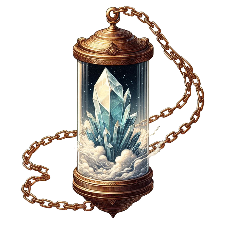 A small shard of deep blue ice inside a thick tube of glass, attached to an iron chain. Unless covered with an insulating material, The shard emits an aura of extreme cold in a 5-foot radius around itself.