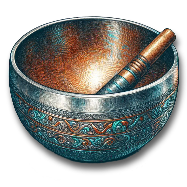 A finely decorated bowl-shaped bell made from thick tarnished metal which can be played either by striking or by rubbing the outside rim to produce a sustained note. It can be filled with water to change the note played.